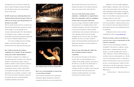 In 2009 you had your conducting debut at the Al Bustan Music Festival in Lebanon. What was it like for you return to give this performance in the land of your birth? This was another dream come true, to return to my beloved home land and share my passion of music with its people. I was most grateful for the visionary cultural personality, Mrs. Myrna Bustani, for inviting me to give a summer session about Gospel Music and American Spirituals culminating in a concert at Al Bustan Summer Festival. It was truly a thrilling and most rewarding feeling to work with Lebanese singers and introduce them to this important American genre.