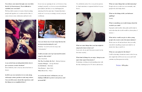 Could you name your top 5 personal favourite songs by other artists? This is hard but: The Way You Make Me Feel – Michael Jackson As an artist from an independent label, does it give you more creative freedom? Most definitely, that’s why my music has been so honest. Careless Whisper – George Michael La Isla Bonita – Madonna Viva Forever – Spice Girls When Doves Cry - Prince