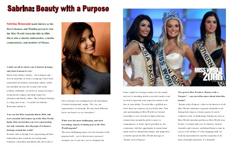 hours a night in a foreign country for one month, and you?re attending media event after media event in a bid to represent your respective nation to the best of your ability. You feel like a goldfish in a bowl; there are cameras on you all the time. That said, participating in Miss World was beyond rewarding: it was a forum for high-achieving women from around the globe to meet, to communicate, to bond. And it provided us, the contestants, with the opportunity to return home much richer in cultural knowledge, and inspired us to further spread the Miss World message of „Beauty with a Purpose?.