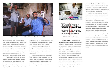 astonishing. The Phoenician DNA marker was found in as many as 6 per cent of people now living in these areas – proving they are descended from Phoenician settlers. The legacy of the Phoenicians is very much alive in the modern world. The issue of Phoenician identity has been a controversial one in Lebanon in recent times. Some have seen it as a divisive issue – that the claim of Phoenician ancestry by some Lebanese is a denial of the country’s Arab and Muslim heritage. However, Dr Zalloua sees his research as a unifying force, not a divisive one. His studies have found that the Phoenician genetic marker is present in both Christian and Muslim populations of Lebanon. There are also many Lebanese, like Dr Zalloua himself, who do not have this marker of Phoenician ancestry, which is most common along the coastal The Phoenician genetic marker areas of the country. Having been a crossroads for travel and invasion throughout its long history, the Dr Pierre Zalloua, a geneticist from the Lebanese American University, undertook a study in search of Phoenician ancestry in the DNA code. He analysed blood samples from people living in cities that were once Phoenician ports, such as Byblos, Tyre and Sidon. Many of these samples were taken from Lebanese fisherman, who, like their Phoenician ancestors, still make their living from the sea. Dr Zalloua succeeded in finding a distinctive genetic marker, the “J2 haplogroup,” that proved Phoenician ancestry. This was compared to samples taken from people living in lands colonised by the Phoenicians across the whole Mediterranean – from Malta, Sardinia, Gibraltar, Spain, North Africa and the Aegean Islands. The results were population is a mix o