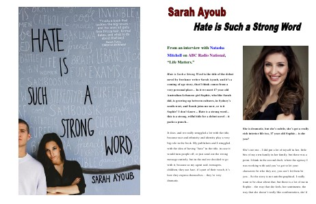 Hate is Such a Strong Word is the title of the debut novel by freelance writer Sarah Ayoub, and it’s a coming of age story, that I think comes from a very personal place... In it we meet 17 year-old Australian-Lebanese girl Sophie, who like Sarah did, is growing up between cultures, in Sydney’s south-west, and Sarah joins me now, or is it Sophie? I don’t know... Hate is a strong word... this is a strong, wilful title for a debut novel – it packs a punch... She is dramatic, but she’s subtle, she’s got a really It does, and we really struggled a lot with the title, because race and ethnicity and identity play a very big role in the book. My publishers and I struggled with the idea of having “hate” in the title, in case it would turn people off, or just send out the wrong message entirely, but in the end we decided to go with it, because as my agent said, teenagers, children, they use hate, it’s part of their vocab, it’s how they express themselves – they’re very dramatic. She’s not me... I did put a lot of myself in her, little bits of my own family in her family, but there was a point, I think in the second draft, where the agency I was working with said you’ve got to let your characters be who they are, you can’t let them be you... So the story is not autobiographical, I really want to be clear about that, but there is a lot of me in Sophie – the way that she feels, her sentiments, the way that she doesn’t really like confrontation, she’d rich interior life too, 17 year-old Sophie... is she you?
