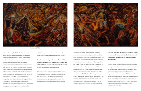 consequences of war, and evolving to universal expressions on human brutality and suffering. They serve as weapons in the fight against violence and war in the world. They traveled through various countries in Latin America and worldwide as “Journey of Art for Peace.” After the end of the Gulf War a series of exhibitions with works on that war were held in Kuwait in 1991-92. I spent nearly two years holding shows in Kuwait and traveling through most of the countries in the Middle East. The attempts to organize a show in Lebanon, however, never materialized – for a variety of different reasons stemming from some ongoing conflicts, general public malaise from the long war, and lack of art space for large-scale work.