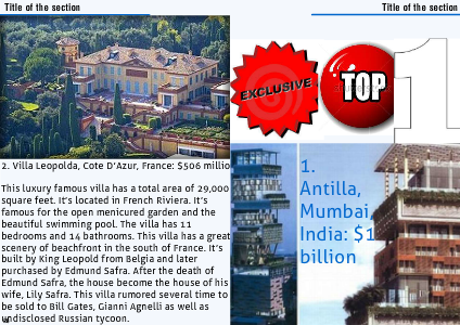 This luxury famous villa has a total area of 29,000 square feet. It’s located in French Riviera. It’s famous for the open menicured garden and the beautiful swimming pool. The villa has 11 bedrooms and 14 bathrooms. This villa has a great scenery of beachfront in the south of France. It’s built by King Leopold from Belgia and later purchased by Edmund Safra. After the death of Edmund Safra, the house become the house of his wife, Lily Safra. This villa rumored several time to be sold to Bill Gates, Gianni Agnelli as well as undisclosed Russian tycoon.