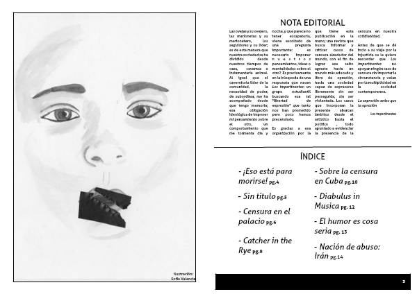 Es gracias a esa organización por la que tiene esta publicación en la mano; una revista que busca informar y críticar casos de censura alrededor del mundo, con el fin de lograr ese salto agreste hacia un mundo más educado y libre de opresión, hacia una sociedad capaz de expresarse libremente sin ser perseguida, sin ser violentada. Los casos que incorporan la presente abarcan ámbitos desde el artístico hasta el político , todo apuntado a evidenciar la presencia de la censura en nuestra cotidianidad.