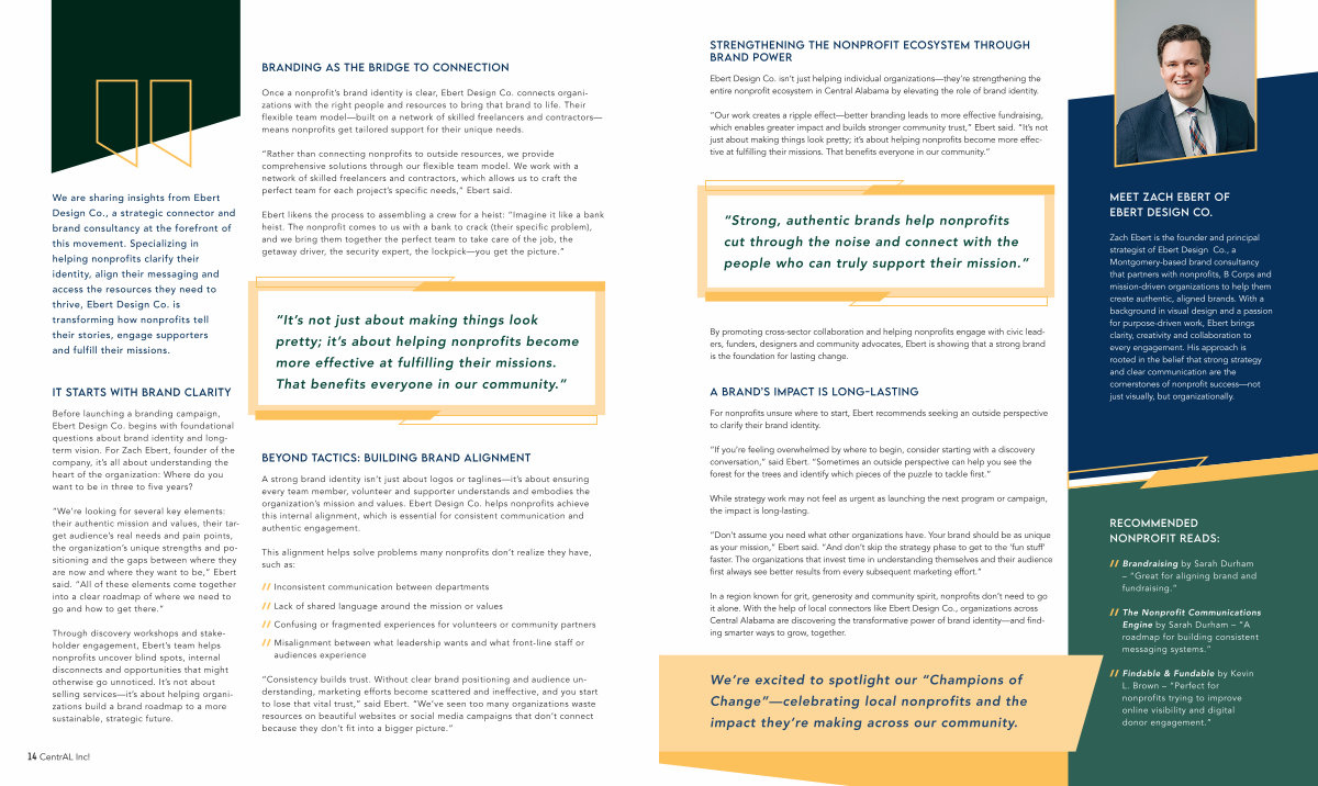Through discovery workshops and stakeholder engagement, Ebert’ s team helps nonprofits uncover blind spots, internal disconnects and opportunities that might otherwise go unnoticed. It’ s not about selling services— it’ s about helping organizations build a brand roadmap to a more sustainable, strategic future.