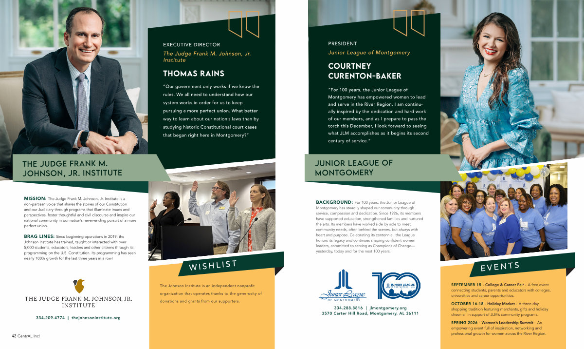 BACKGROUND: For 100 years, the Junior League of Montgomery has steadily shaped our community through service, compassion and dedication. Since 1926, its members have supported education, strengthened families and nurtured the arts. Its members have worked side by side to meet community needs, often behind the scenes, but always with heart and purpose. Celebrating its centennial, the League honors its legacy and continues shaping confident women leaders, committed to serving as Champions of Change— yesterday, today and for the next 100 years.