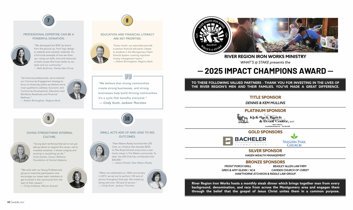River Region Iron Works hosts a monthly steak dinner which brings together men from every background, denomination, and race from across the Montgomery area and engages them through the belief that the gospel of Jesus Christ unites them in a common purpose.