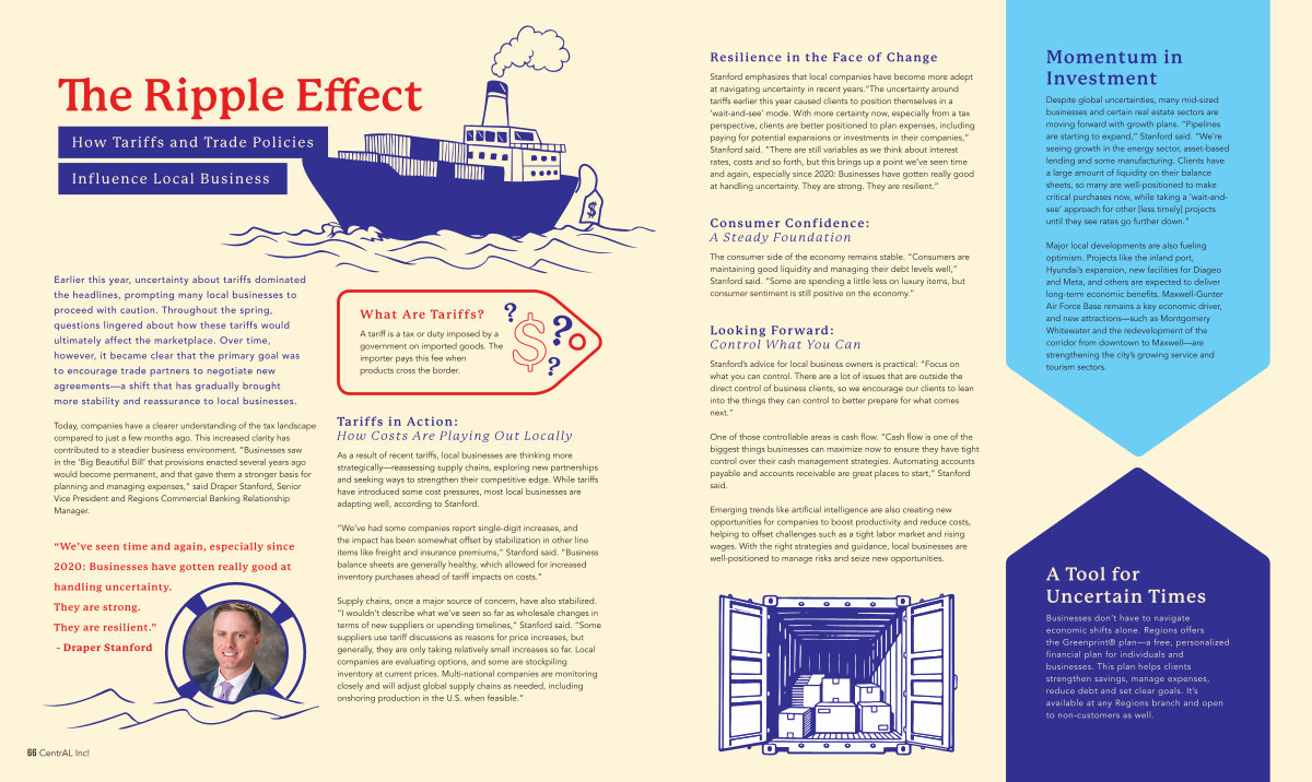 Today, companies have a clearer understanding of the tax landscape compared to just a few months ago. This increased clarity has contributed to a steadier business environment.“ Businesses saw in the‘ Big Beautiful Bill’ that provisions enacted several years ago would become permanent, and that gave them a stronger basis for planning and managing expenses,” said Draper Stanford, Senior Vice President and Regions Commercial Banking Relationship Manager.