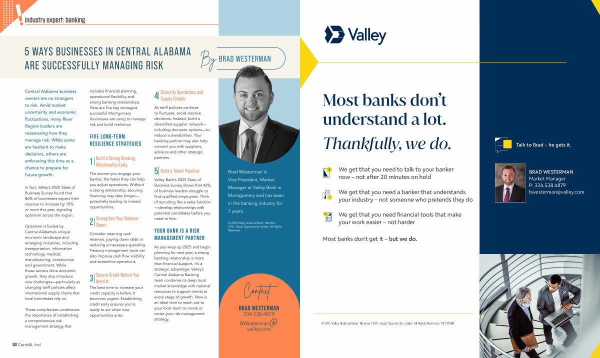 As you wrap up 2025 and begin planning for next year, a strong banking relationship is more than financial support, it’ s a strategic advantage. Valley’ s Central Alabama Banking team combines its deep local market knowledge with national resources to support clients at every stage of growth. Now is an ideal time to reach out to your local team to create or revise your risk management strategy.