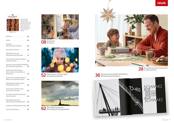 Wir hoffen, Sie haben im Laufe des Jahres viele schöne Momente erlebt und Erinnerungen in Ihrem Herzen und auch auf Fotos gesammelt. Das Jahresende kommt näher – und damit unser Herzensthema: das Schenken. Entdecken Sie in der FOTOZEIT neue Ideen von der Foto-Keksdose bis zur farbigen Innenseite im CEWE FOTOBUCH. Bestens ausgestattet sind Sie mit dem Update der CEWE Fotowelt Software, um bequem und zuverlässig aus Ihren Fotos ganz persönliche Geschenke kreieren zu können. Lesen Sie mehr zu Neuheiten und Funktionen auf Seite 42.