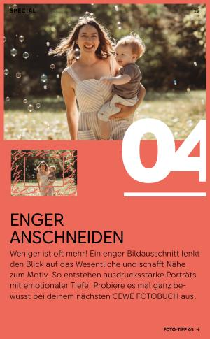 Weniger ist oft mehr! Ein enger Bildausschnitt lenkt den Blick auf das Wesentliche und schafft Nähe zum Motiv. So entstehen ausdrucksstarke Porträts mit emotionaler Tiefe. Probiere es mal ganz bewusst bei deinem nächsten CEWE FOTOBUCH aus.