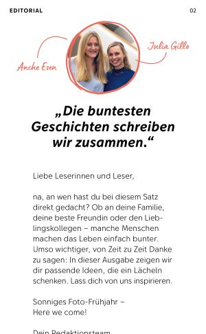 na, an wen hast du bei diesem Satz direkt gedacht? Ob an deine Familie, deine beste Freundin oder den Lieblingskollegen – manche Menschen machen das Leben einfach bunter. Umso wichtiger, von Zeit zu Zeit Danke zu sagen: In dieser Ausgabe zeigen wir dir passende Ideen, die ein Lächeln schenken. Lass dich von uns inspirieren.