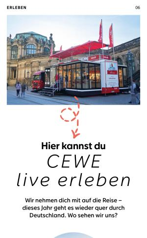23. Mai bis 1. Juni 2025 Umweltfotofestival Zingst Das Umweltfotofestival „ horizonte zingst“ beeindruckt mit Ausstellungen im ganzen Ort – sogar am Ostseestrand – und wird von CEWE unter anderem mit Workshops und Fotowalks bereichert.