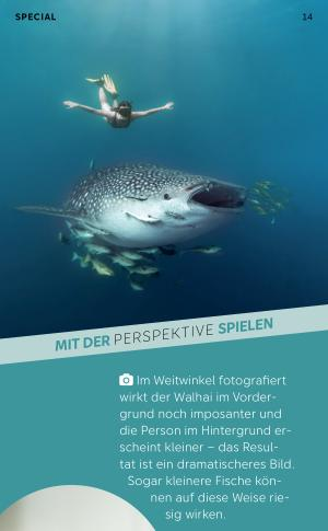 � Im Weitwinkel fotografiert wirkt der Walhai im Vordergrund noch imposanter und die Person im Hintergrund erscheint kleiner – das Resultat ist ein dramatischeres Bild. Sogar kleinere Fische können auf diese Weise riesig wirken.
