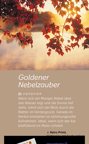 Wenn sich am Morgen Nebel über das Wasser legt und die Sonne tief steht, lohnt sich der Blick durch die Blätter im Vordergrund. Gerade im Herbst entstehen so stimmungsvolle Aufnahmen. Ideal, wenn sich der Ast bildfüllend ins Motiv schiebt.