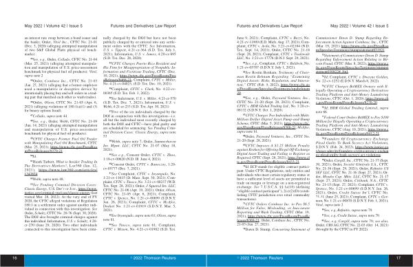 May 2022 | Volume 42 | Issue 5 Futures and Derivatives Law Report an interest rate swap between a bond issuer and the bank ); Order , Vitol Inc ., CFTC No . 21-01 ( Dec . 3 , 2020 ) ( alleging attempted manipulation of two S & P Global Platts physical oil benchmarks ).