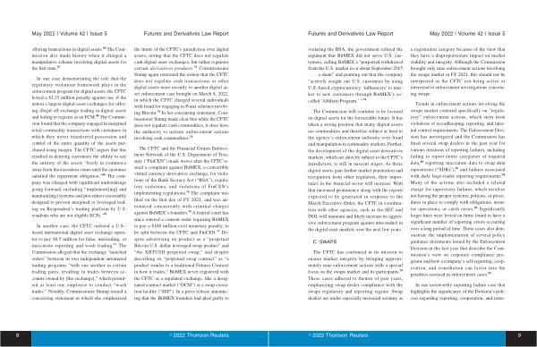 May 2022 | Volume 42 | Issue 5 Futures and Derivatives Law Report offering transactions in digital assets . 66 The Commission also made history when it charged a manipulative scheme involving digital assets for the first time . 67