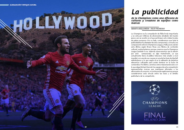 La Champions es la competición de fútbol más importante y es vista por millones de aficionados alrededor del mundo pese a ser un evento en el que participan solo clubes locales de países europeos. Por un lado, consideramos que toda la publicidad hecha alrededor de este campeonato, connota una comparación entre la Champions League y Hollywood, siendo esta última según Bruno Rivas una fábrica de contenido cultural, sustentaríamos porque creemos que la Champions League también lo es. Además observaremos que la afición por este campeonato es algo mainstream, ya que actualmente tiene al público televisivo más amplio a nivel mundial, con una de sus causas en una de las tesis de Martell, refiriéndonos a lo que según el es la adhesión de distintos elementos culturales para poder dominar en la lucha de contenidos. Por último, veremos cómo relacionando esto con lo que alega Richard Sennet, los equipos de esta competición representarían marcas que mantienen aferrados a los aficionados al consumo. A continuación explicaremos porque consideramos este vínculo entre las tesis y el ámbito publicitario de la competición.