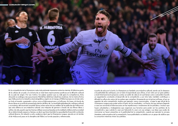 A partir de esto por lo tanto, la Champions es también una industria cultural, siendo así, le daremos a la publicidad dos enfoques, por un lado el espectáculo que ofrece, al ser visto por un gran público a nivel internacional, le propone a estos un estilo de vida en el cual tienen como costumbre hacerle un seguimiento constante al desarrollo de la competición; y por otro lado, también contribuye a difundir la cultura de varios de los países que compiten. Empezando por el primer enfoque, el ser un seguidor de esta competición, implica por ejemplo, verse coaccionados a bajar la app oficial de la Champions League para poder estar al tanto de los resultados, o el hecho de que siempre llegando a casa uno encienda el televisor para ver las repeticiones o resúmenes de los partidos, o incluso que hayan estudiantes y trabajadores que organicen sus horarios para poder ver los partidos de la competición y que cuándo lo vean por televisión lo vean con sus amigos. Las ideas que acabo de mencionar se hacen presentes en la publicidad de la competición, cuando por ejemplo la cerveza Heineken, patrocinadora de la competición, hace publicidad a su bebida con un grupo de adultos que la consumen mientras miran los partidos.