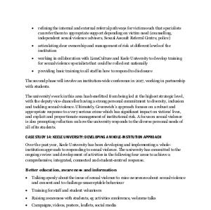 Over the past year, Keele University has been developing and implementing a wholeinstitution approach to responding to sexual violence. The university has committed to the ongoing review and development of activities in the following four areas to achieve a comprehensive, integrated, connected and student-centred response.