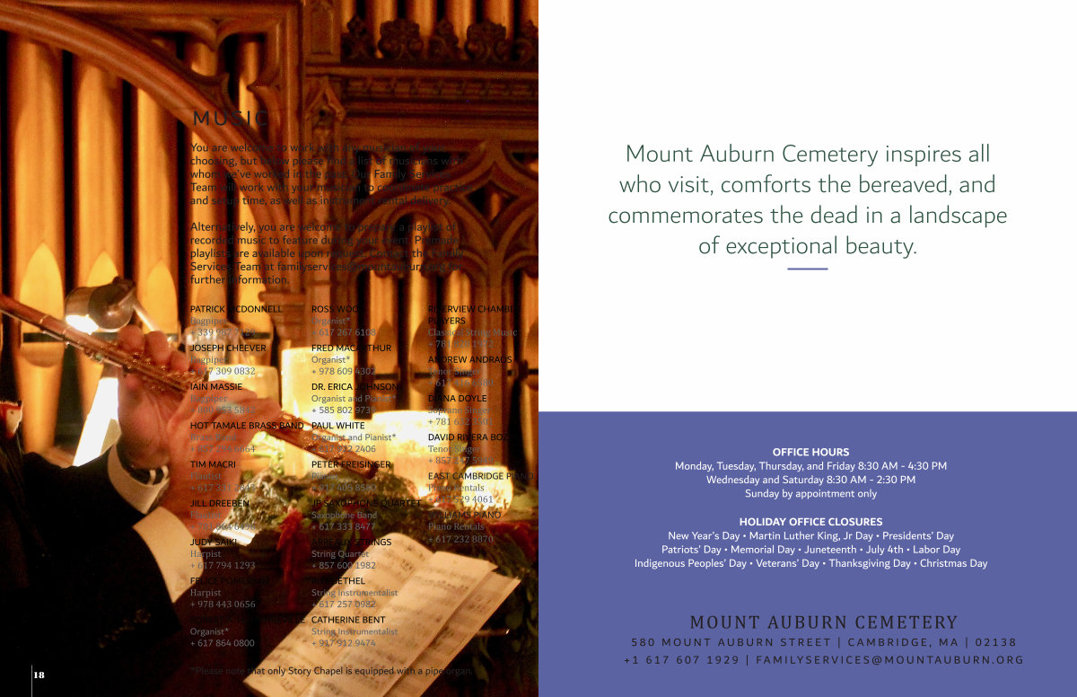 Alternatively, you are welcome to prepare a playlist of recorded music to feature during your event. Premade playlists are available upon request. Contact the Family Services Team at familyservices @ mountauburn. org for further information.