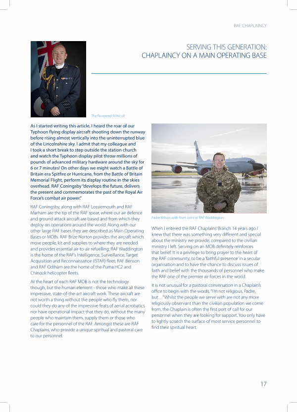 At the heart of each RAF MOB is not the technology though, but the human element- those who make all these impressive, state-of-the-art aircraft work. These aircraft are not worth a thing without the people who fly them, nor could they do any of the impressive feats of aerial acrobatics nor have operational impact that they do, without the many people who maintain them, supply them or those who care for the personnel of the RAF. Amongst these are RAF Chaplains, who provide a unique spiritual and pastoral care to our personnel.