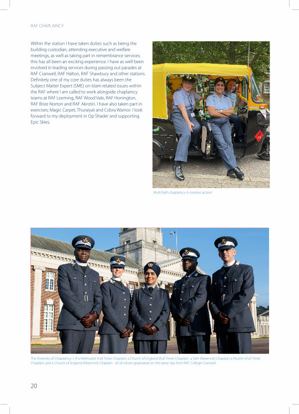 Within the station I have taken duties such as being the building custodian, attending executive and welfare meetings, as well as taking part in remembrance services; this has all been an exciting experience. I have as well been involved in leading services during passing out parades at RAF Cranwell, RAF Halton, RAF Shawbury and other stations. Definitely one of my core duties has always been the Subject Matter Expert( SME) on Islam related issues within the RAF where I am called to work alongside chaplaincy teams at RAF Leeming, RAF Wood Vale, RAF Honington, RAF Brize Norton and RAF Akrotiri. I have also taken part in exercises; Magic Carpet, Thuraiyat and Cobra Warrior. I look forward to my deployment in Op Shader and supporting Epic Skies.