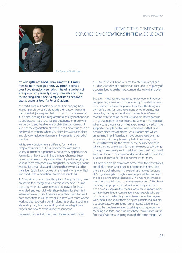 I’ m writing this on Good Friday, almost 5,000 miles from home in 40 degree heat. My‘ parish’ is spread over 5 countries, between which I travel in the back of a cargo aircraft, generally at very unsociable hours in the morning. This is one example of life on deployed operations for a Royal Air Force Chaplain.