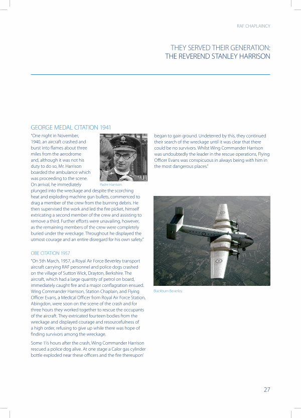 “ On 5th March, 1957, a Royal Air Force Beverley transport aircraft carrying RAF personnel and police dogs crashed on the village of Sutton Wick, Drayton, Berkshire. The aircraft, which had a large quantity of petrol on board, immediately caught fire and a major conflagration ensued. Wing Commander Harrison, Station Chaplain, and Flying Officer Evans, a Medical Officer from Royal Air Force Station, Abingdon, were soon on the scene of the crash and for three hours they worked together to rescue the occupants of the aircraft. They extricated fourteen bodies from the wreckage and displayed courage and resourcefulness of a high order, refusing to give up while there was hope of finding survivors among the wreckage.