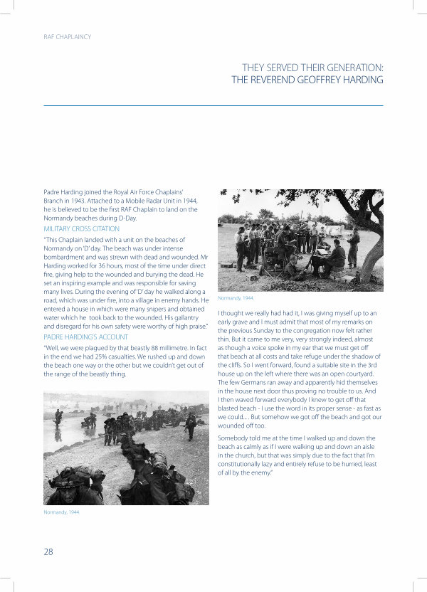 Padre Harding joined the Royal Air Force Chaplains’ Branch in 1943. Attached to a Mobile Radar Unit in 1944, he is believed to be the first RAF Chaplain to land on the Normandy beaches during D-Day. MILITARY CROSS CITATION