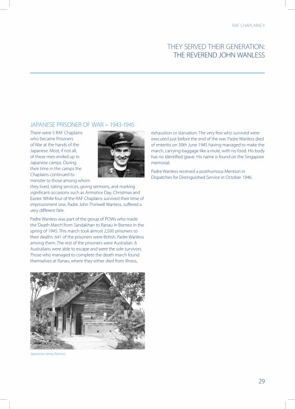 exhaustion or starvation. The very few who survived were executed just before the end of the war. Padre Wanless died of enteritis on 30th June 1945 having managed to make the march, carrying baggage like a mule, with no food. His body has no identified grave. His name is found on the Singapore memorial.