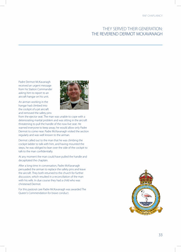 An airman working in the hangar had climbed into the cockpit of a jet aircraft and removed the safety pins from the ejector seat. The man was unable to cope with a deteriorating marital problem and was sitting in the aircraft threatening to pull the handle of the now live seat. He warned everyone to keep away; he would allow only Padre Dermot to come near. Padre McKavanagh visited the section regularly and was well known to the airman.