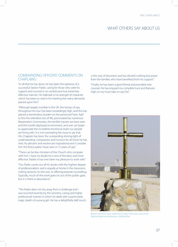“ Although largely invisible in the UK, the tempo of ops throughout his tour has been exceedingly high, and this has placed a tremendous burden on the personnel here. Add to this the relentless loss of life, punctuated by numerous Repatriation Ceremonies, the terrible injuries we have seen and the hostile deployed environment, and one can begin to appreciate the incredible emotional strain our people are living with. It is not overstating the issue to say that this Chaplain has been the outstanding shining light of understanding, compassion and humour for all those he has met; his altruism and resolve are inspirational and I consider him the finest padre I have seen in 15 years of ops.”