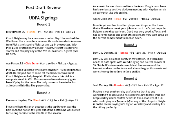 Good is yet another troubled player and it's picks like these that will make or break your job as a coach. Let's just hope for Daigle's sake they work out. Good was very good at Texas and has sure fire hands and great athleticism. He very well could be the perfect complement to Keenan Allen.