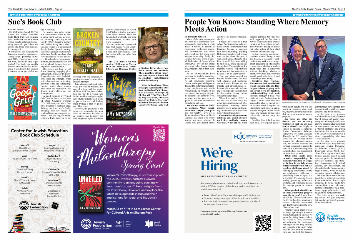 at Shalom Park, where Confino’ s novels are available. Those unable to attend in person may request a Zoom link by emailing sueb. littauer @ jewishcharlotte. org.