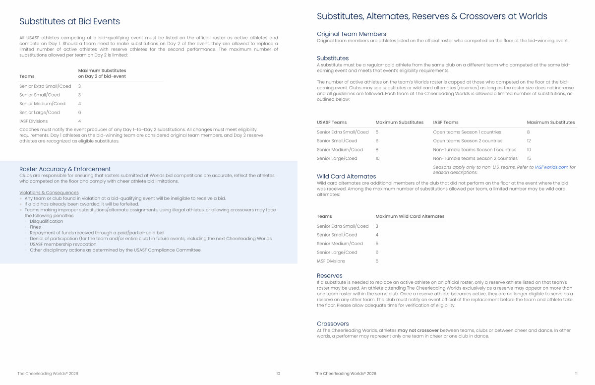 The number of active athletes on the team’ s Worlds roster is capped at those who competed on the floor at the bidearning event. Clubs may use substitutes or wild card alternates( reserves) as long as the roster size does not increase and all guidelines are followed. Each team at The Cheerleading Worlds is allowed a limited number of substitutions, as outlined below: