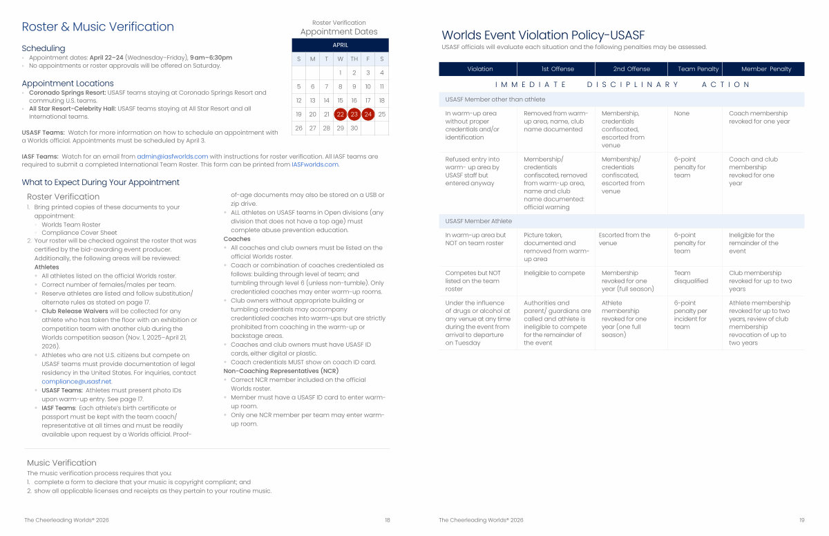USASF Teams: Watch for more information on how to schedule an appointment with a Worlds official. Appointments must be scheduled by April 3.
