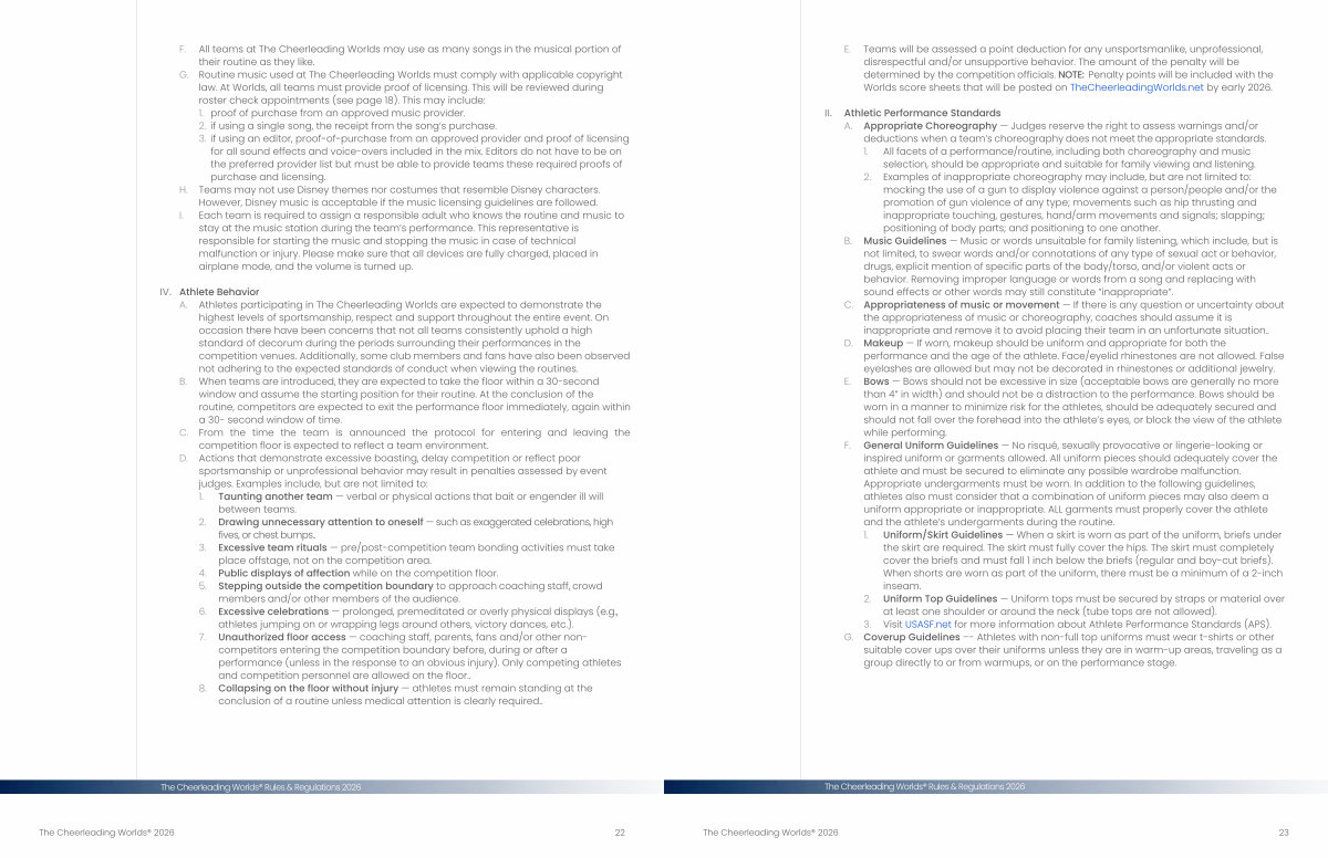 F. All teams at The Cheerleading Worlds may use as many songs in the musical portion of their routine as they like.