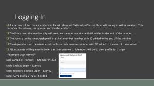 � The Primary on the membership will use their member number with 01 added to the end of the number . � The Spouse on the membership will use their member number with 02 added to the end of the number . � The dependents on the membership will use their member number with 03 added to the end of the number . � ALL Accounts will begin with Golfer1 as their password . Members will go to their profile to change . ** Example User Names ** Nick Campbell ( Primary ) – Member # 1234 Nicks Chelsea Login – 123401 Nicks Spouse ’ s Chelsea Login – 123402 Nicks Son ’ s Chelsea Login - 123403