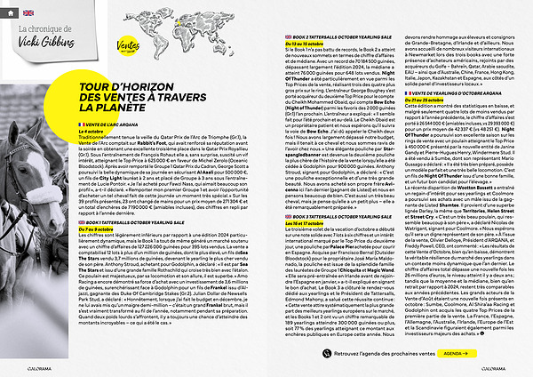 Du 7 au 9 octobre Les chiffres sont légèrement inférieurs par rapport à une édition 2024 particulièrement dynamique, mais le Book 1 a tout de même généré un marché soutenu avec un chiffre d’ affaires de 127 226 000 guinées pour 395 lots vendus. La vente a comptabilisé 12 lots à plus d’ un million de guinées, dont le plus élevé, un fils de Sea The Stars vendu 3,7 millions de guinées, devenant le yearling le plus cher vendu de son père. Anthony Stroud, achetant pour Godolphin, a déclaré: « Il est par Sea The Stars et issu d’ une grande famille Rothschild qui croise très bien avec l’ étalon. Ce poulain est majestueux, par sa locomotion et son allure, il est superbe. » Amo Racing a encore démontré sa force d’ achat avec un investissement de 3,6 millions de guinées, surenchérissant face à Godolphin pour un fils de Frankel issu d’ Aljazzi, gagnante des Duke Of Cambridge Stakes( Gr. 2). Julian Dollar de Newsells Park Stud, a déclaré: « Honnêtement, lorsque j’ ai fait le budget en décembre, je ne lui avais mis qu’ un maigre demi-million – c’ était un grand Frankel brut, mais il s’ est vraiment transformé au fil de l’ année, notamment pendant sa préparation. Quand deux poids lourds s’ affrontent, il y a toujours une chance d’ atteindre des montants incroyables – ce qui a été le cas. »