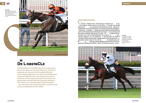 18 OCTOBRE À AUTEUIL Prix Isopani( 3 ans – haies – 3 600 mètres) La journée a débuté avec cette épreuve réservée aux AQPS de 3 ans n’ ayant jamais couru sur les haies. Le lauréat de l’ année dernière, Lulamba, a ensuite terminé deuxième lors du Festival de Cheltenham avant de remporter un Groupe 1 durant le prestigieux Festival de Punchestown; autant dire que l’ attente était grande et que le rond de présentation était plein à craquer. La course a favorisé les chevaux placés près de la tête, et Mon Marcel a décroché les honneurs en offrant confortablement à son père, Headman, son premier gagnant sur les obstacles. Le pensionnaire de Gabriel Leenders a bien sauté et bien voyagé tout au long du parcours. Le deuxième mérite aussi d’ être cité: Misterdoc, le superbe gris par Goliath du Berlais, perd peu dans la défaite et s’ annonce comme un espoir prometteur pour Mickaël Seror, s’ il reste lui aussi en France.