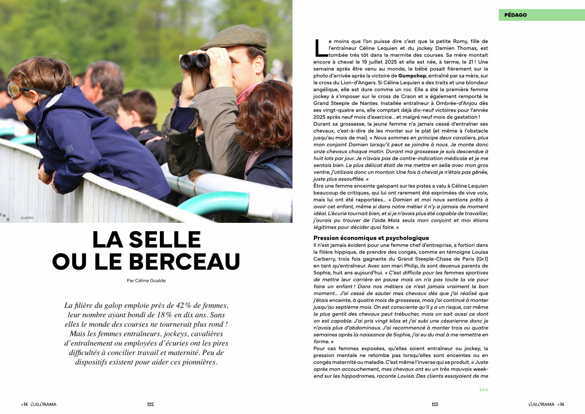 Le moins que l’ on puisse dire c’ est que la petite Romy, fille de l’ entraîneur Céline Lequien et du jockey Damien Thomas, est tombée très tôt dans la marmite des courses. Sa mère montait encore à cheval le 19 juillet 2025 et elle est née, à terme, le 21! Une semaine après être venu au monde, le bébé posait fièrement sur la photo d’ arrivée après la victoire de Gumpchop, entraîné par sa mère, sur le cross du Lion-d’ Angers. Si Céline Lequien a des traits et une blondeur angélique, elle est dure comme un roc. Elle a été la première femme jockey à s’ imposer sur le cross de Craon et a également remporté le Grand Steeple de Nantes. Installée entraîneur à Ombrée-d’ Anjou dès ses vingt-quatre ans, elle comptait déjà dix-neuf victoires pour l’ année 2025 après neuf mois d’ exercice … et malgré neuf mois de gestation! Durant sa grossesse, la jeune femme n’ a jamais cessé d’ entraîner ses chevaux, c’ est-à-dire de les monter sur le plat( et même à l’ obstacle jusqu’ au mois de mai). « Nous sommes en principe deux cavaliers, plus mon conjoint Damien lorsqu’ il peut se joindre à nous. Je monte donc onze chevaux chaque matin. Durant ma grossesse je suis descendue à huit lots par jour. Je n’ avais pas de contre-indication médicale et je me sentais bien. Le plus délicat était de me mettre en selle avec mon gros ventre, j’ utilisais donc un montoir. Une fois à cheval je n’ étais pas gênée, juste plus essoufflée. » Être une femme enceinte galopant sur les pistes a valu à Céline Lequien beaucoup de critiques, qui lui ont rarement été exprimées de vive voix, mais lui ont été rapportées … « Damien et moi nous sentions prêts à avoir cet enfant, même si dans notre métier il n’ y a jamais de moment idéal. L’ écurie tournait bien, et si je n’ avais plus été capable de travailler, j’ aurais pu trouver de l’ aide. Mais seuls mon conjoint et moi étions légitimes pour décider quoi faire. »