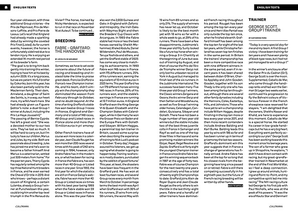 In the winner’ s enclosure after the Qatar Prix du Cadran( Gr. 1), George Scott is over the moon. Supplemented, Caballo de Mar, who came through the handicap ranks and had won the German St Leger two weeks earlier, continued his progression to fly the Bahraini colours of Victorious Forever in the French showpiece race reserved for stayers.“ I am delighted that the owners, Sheikhs Nasser and Khalid, are here to experience this moment. Caballo de Mar is a special horse. He started his career in low-grade handicaps but he has a very big heart. Everything went perfectly according to our plan.” George Scott has been working towards this moment since his teenage years. The son of a farmer who grew up in Shropshire, he explains,“ I didn’ t have direct contact with racing, but my great-grandfather trained in Newmarket at the end of the First World War, so I feel a deep connection. I grew up around animals, hunting and Point-to-Point, and my competitive spirit led me into racing.” The NH-racing culture led George to his first job with Paul Nicholls, who was at the peak of his powers.“ It was the era of Kauto Star and Denman!