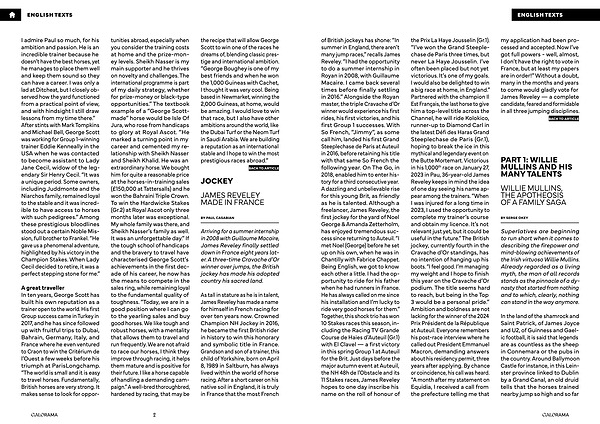 A great traveller In ten years, George Scott has built his own reputation as a trainer open to the world. His first Group success came in Turkey in 2017, and he has since followed up with fruitful trips to Dubai, Bahrain, Germany, Italy, and France where he even ventured to Craon to win the Critérium de l’ Ouest a few weeks before his triumph at ParisLongchamp.“ The world is small and it is easy to travel horses. Fundamentally, British horses are very strong. It makes sense to look for oppor- tunities abroad, especially when you consider the training costs at home and the prize-money levels. Sheikh Nasser is my main supporter and he thrives on novelty and challenges. The international programme is part of my daily strategy, whether for prize-money or black-type opportunities.” The textbook example of a“ George Scottmade” horse would be Isle Of Jura, who rose from handicaps to glory at Royal Ascot.“ He marked a turning point in my career and cemented my relationship with Sheikh Nasser and Sheikh Khalid. He was an extraordinary horse. We bought him for quite a reasonable price at the horses-in-training sales(£ 150,000 at Tattersalls) and he won the Bahraini Triple Crown. To win the Hardwicke Stakes( Gr. 2) at Royal Ascot only three months later was exceptional. My whole family was there, and Sheikh Nasser’ s family as well. It was an unforgettable day.” If the tough school of handicaps and the bravery to travel have characterised George Scott’ s achievements in the first decade of his career, he now has the means to compete in the sales ring, while remaining loyal to the fundamental quality of toughness.“ Today, we are in a good position where I can go to the yearling sales and buy good horses. We like tough and robust horses, with a mentality that allows them to travel and run frequently. We are not afraid to race our horses, I think they improve through racing, it helps them mature and is positive for their future. I like a horse capable of handling a demanding campaign.” A well-bred thoroughbred, hardened by racing, that may be the recipe that will allow George Scott to win one of the races he dreams of, blending classic prestige and international ambition.“ George Boughey is one of my best friends and when he won the 1,000 Guineas with Cachet, I thought it was very cool. Being based in Newmarket, winning the 2,000 Guineas, at home, would be amazing. I would love to win that race, but I also have other ambitions around the world, like the Dubai Turf or the Neom Turf in Saudi Arabia. We are building a reputation as an international stable and I hope to win the most prestigious races abroad.”