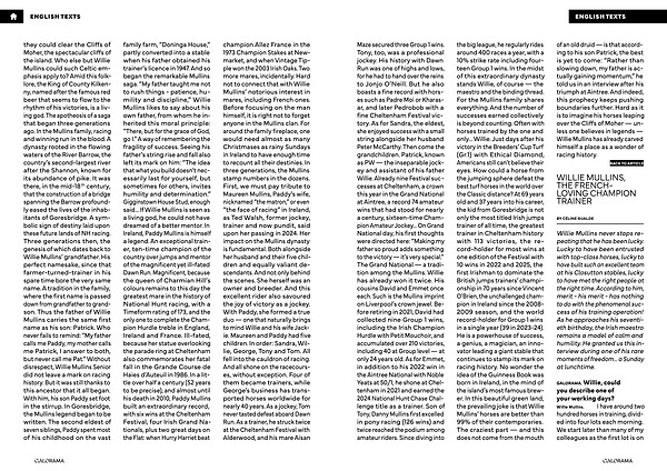 Maze secured three Group 1 wins. Tony, too, was a professional jockey. His history with Dawn Run was one of highs and lows, for he had to hand over the reins to Jonjo O’ Neill. But he also boasts a fine record with horses such as Padre Moi or Kharasar, and later Pedrobob with a fine Cheltenham Festival victory. As for Sandra, the eldest, she enjoyed success with a small string alongside her husband Peter McCarthy. Then come the grandchildren. Patrick, known as PW— the inseparable jockey and assistant of his father Willie. Already nine Festival successes at Cheltenham, a crown this year in the Grand National at Aintree, a record 74 amateur wins that had stood for nearly a century, sixteen-time Champion Amateur Jockey … On Grand National day, his first thoughts were directed here:“ Making my father so proud adds something to the victory— it’ s very special.” The Grand National— a tradition among the Mullins. Willie has already won it twice. His cousins David and Emmet once each. Such is the Mullins imprint on Liverpool’ s crown jewel. Before retiring in 2021, David had collected nine Group 1 wins, including the Irish Champion Hurdle with Petit Mouchoir, and accumulated over 210 victories, including 40 at Group level— at only 24 years old. As for Emmet, in addition to his 2022 win in the Aintree National with Noble Yeats at 50 / 1, he shone at Cheltenham in 2021 and earned the 2024 National Hunt Chase Challenge title as a trainer. Son of Tony, Danny Mullins first excelled in pony racing( 126 wins) and twice reached the podium among amateur riders. Since diving into the big league, he regularly rides around 400 races a year, with a 10 % strike rate including fourteen Group 1 wins. In the midst of this extraordinary dynasty stands Willie, of course— the maestro and the binding thread. For the Mullins family shares everything. And the number of successes earned collectively is beyond counting. Often with horses trained by the one and only … Willie. Just days after his victory in the Breeders’ Cup Turf( Gr. 1) with Ethical Diamond, Americans still can’ t believe their eyes. How could a horse from the jumping sphere defeat the best turf horses in the world over the Classic distance? At 69 years old and 37 years into his career, the kid from Goresbridge is not only the most titled Irish jumps trainer of all time, the greatest trainer in Cheltenham history with 113 victories, the record-holder for most wins at one edition of the Festival with 10 wins in 2022 and 2025, the first Irishman to dominate the British jumps trainers’ championship in 70 years since Vincent O’ Brien, the unchallenged champion in Ireland since the 2008- 2009 season, and the world record-holder for Group 1 wins in a single year( 39 in 2023-24). He is a powerhouse of success, a genius, a magician, an innovator leading a giant stable that continues to stamp its mark on racing history. No wonder the idea of the Guinness Book was born in Ireland, in the mind of the island’ s most famous brewer. In this beautiful green land, the prevailing joke is that Willie Mullins’ horses are better than 99 % of their contemporaries. The craziest part— and this does not come from the mouth of an old druid— is that according to his son Patrick, the best is yet to come:“ Rather than slowing down, my father is actually gaining momentum,” he told us in an interview after his triumph at Aintree. And indeed, this prophecy keeps pushing boundaries further. Hard as it is to imagine his horses leaping over the Cliffs of Moher— unless one believes in legends— Willie Mullins has already carved himself a place as a wonder of racing history.
