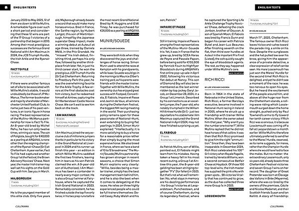 They were both kids when they discovered the joys and challenges of horse racing. Simon Munir used to attend the races at Kempton with his grandparents, while Isaac Souede would go in the mornings to Maurice Zilber’ s training yard, as his parents were friends with the master trainer. Together with Willie Mullins, the ownership duo has enjoyed great success with Footpad, Concertista, El Fabiolo, Impaire et Passe and Jasmin de Vaux, all winners during the Cheltenham Festival, the biggest NH racing meeting in the world. Their purchasing policy remains open for these passionate of National-Hunt, even extending to buying flat yearlings. In 2024, Simon Munir explained:“ Intellectually, it is more satisfying to buy a horse for a reasonable price rather than simply buying the most expensive horse. We also breed in France, where we have a band of 10 to 12 broodmares.” The Munir / Souede / Mullins partnership has grown stronger in recent seasons, a choice that Simon Munir explains very clearly:“ Willie, besides being a master trainer, simply has the best management team behind him, and he is also the best when it comes to delegating at the races. He relies on three highly experienced people who could be full trainers themselves: David Casey, Ruby Walsh and his