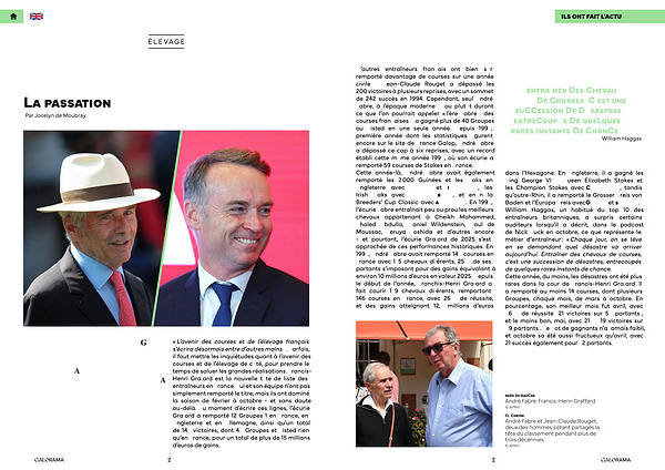 dans l’ Hexagone. En Angleterre, il a gagné les King George VI & Queen Elizabeth Stakes et les Champion Stakes avec Calandagan, tandis qu’ outre-Rhin, il a remporté le Grosser Preis von Baden et l’ Europa Preis avec Goliath et Sibayan. William Haggas, un habitué du top 10 des entraîneurs britanniques, a surpris certains auditeurs lorsqu’ il a décrit, dans le podcast de Nick Luck en octobre, ce que représente le métier d’ entraîneur: « Chaque jour, on se lève en se demandant quel désastre va arriver aujourd’ hui. Entraîner des chevaux de courses, c’ est une succession de désastres, entrecoupés de quelques rares instants de chance. » Cette année, du moins, les désastres ont été plus rares dans la cour de Francis-Henri Graffard. Il a remporté au moins 14 courses, dont plusieurs Groupes, chaque mois, de mars à octobre. En pourcentage, son meilleur mois fut avril, avec 36 % de réussite( 21 victoires sur 58 partants), et le moins bon, mai, avec 21 %( 19 victoires sur 89 partants). Le flot de gagnants n’ a jamais faibli, et octobre sa été aussi fructueux qu’ avril, avec 21 succès également pour 72 partants.