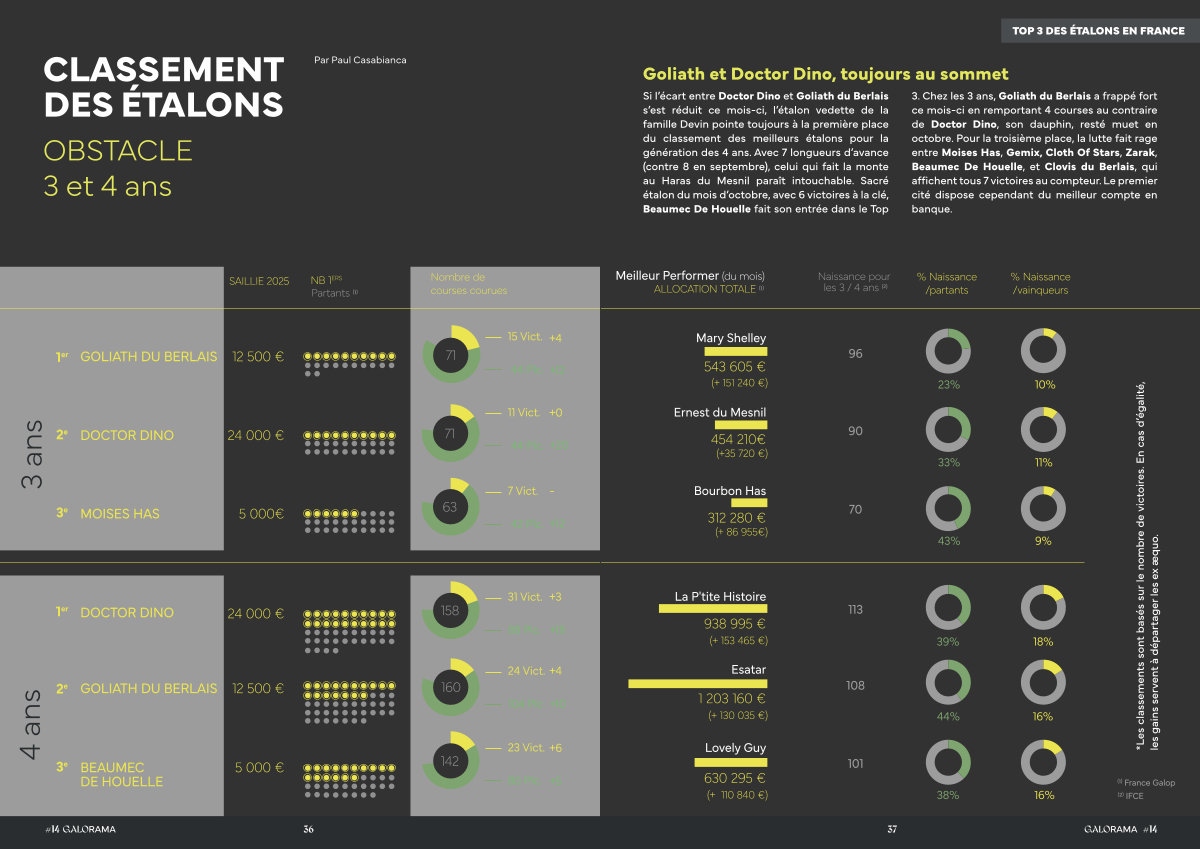 3. Chez les 3 ans, Goliath du Berlais a frappé fort ce mois-ci en remportant 4 courses au contraire de Doctor Dino, son dauphin, resté muet en octobre. Pour la troisième place, la lutte fait rage entre Moises Has, Gemix, Cloth Of Stars, Zarak, Beaumec De Houelle, et Clovis du Berlais, qui affichent tous 7 victoires au compteur. Le premier cité dispose cependant du meilleur compte en banque.
