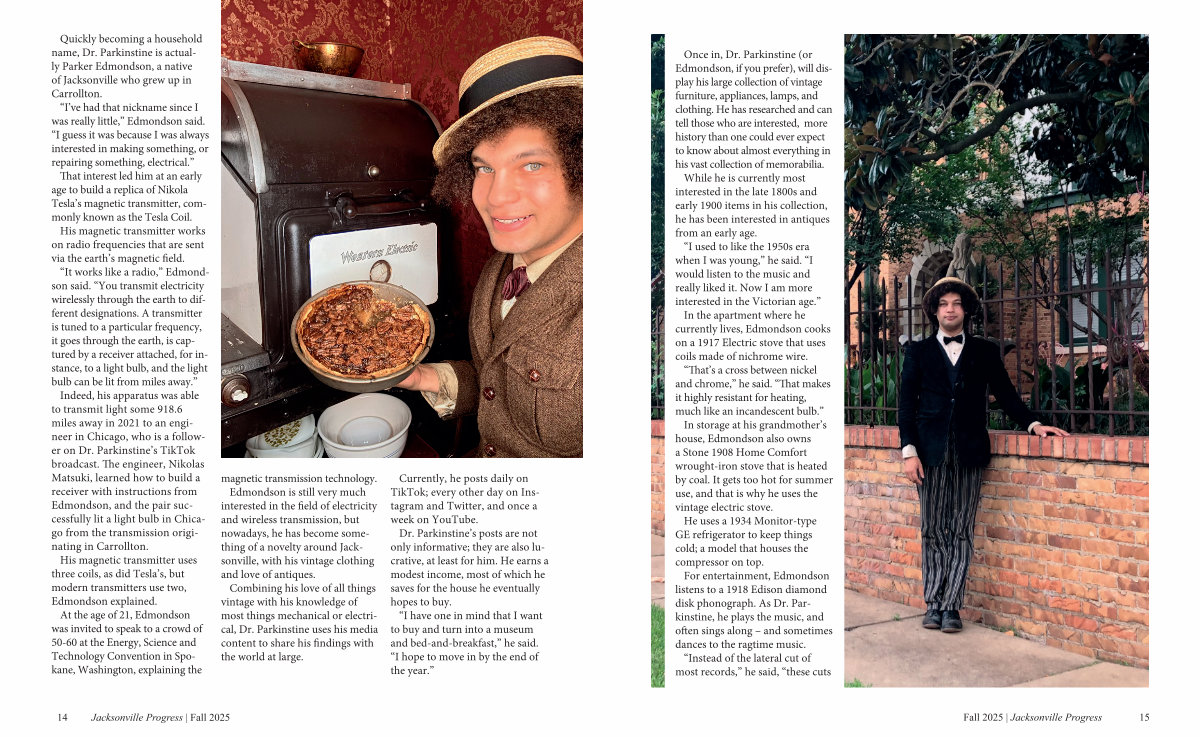 At the age of 21, Edmondson was invited to speak to a crowd of 50-60 at the Energy, Science and Technology Convention in Spokane, Washington, explaining the magnetic transmission technology. Edmondson is still very much interested in the field of electricity and wireless transmission, but nowadays, he has become something of a novelty around Jacksonville, with his vintage clothing and love of antiques.