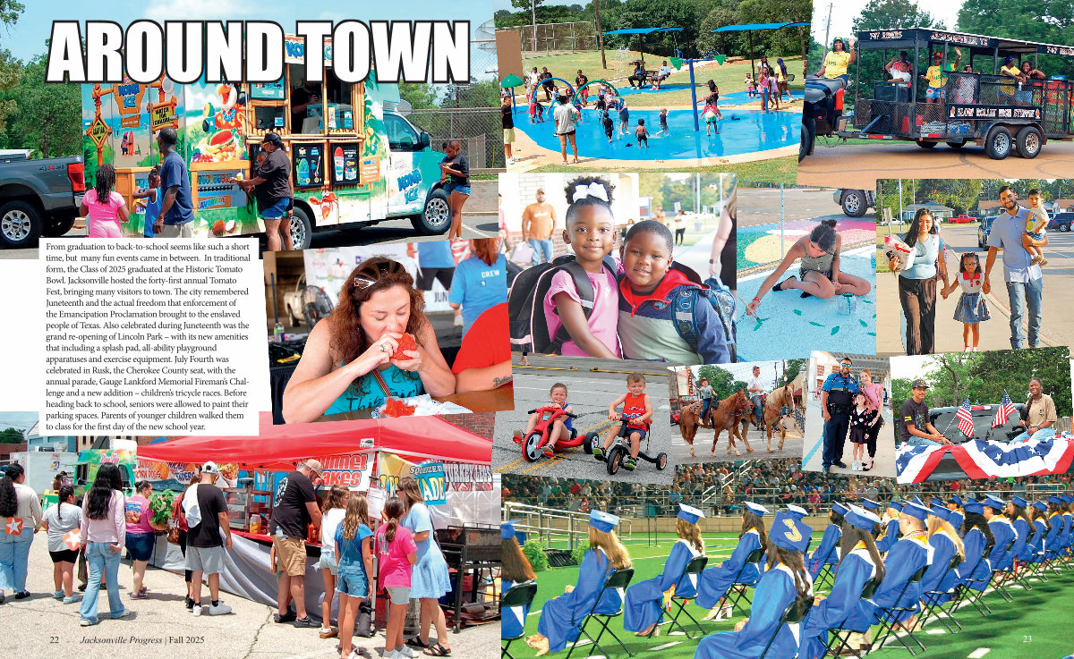 From graduation to back-to-school seems like such a short time, but many fun events came in between. In traditional form, the Class of 2025 graduated at the Historic Tomato Bowl. Jacksonville hosted the forty-first annual Tomato Fest, bringing many visitors to town. The city remembered Juneteenth and the actual freedom that enforcement of the Emancipation Proclamation brought to the enslaved people of Texas. Also celebrated during Juneteenth was the grand re-opening of Lincoln Park – with its new amenities that including a splash pad, all-ability playground apparatuses and exercise equipment. July Fourth was celebrated in Rusk, the Cherokee County seat, with the annual parade, Gauge Lankford Memorial Fireman’ s Challenge and a new addition – children’ s tricycle races. Before heading back to school, seniors were allowed to paint their parking spaces. Parents of younger children walked them to class for the first day of the new school year.